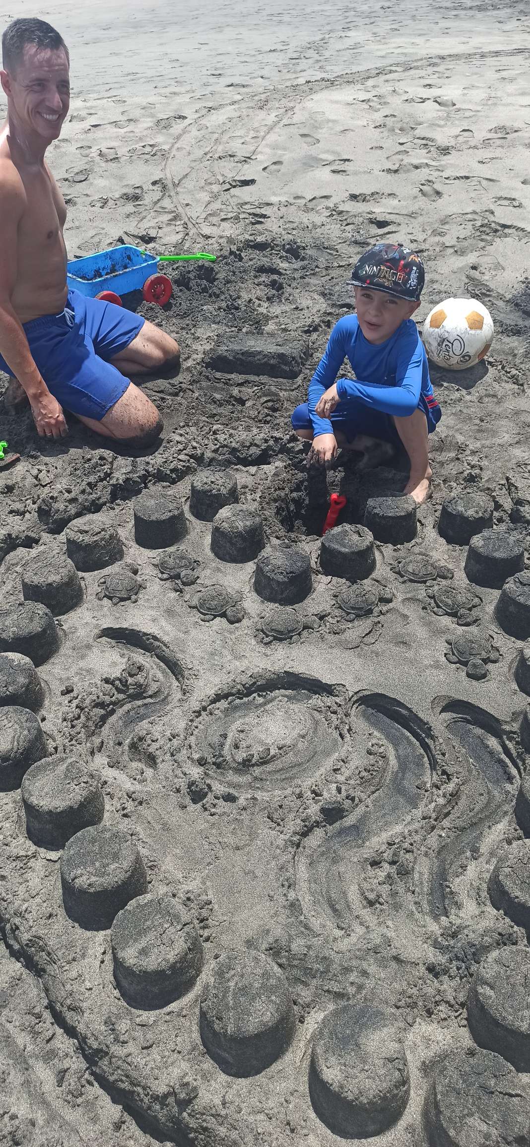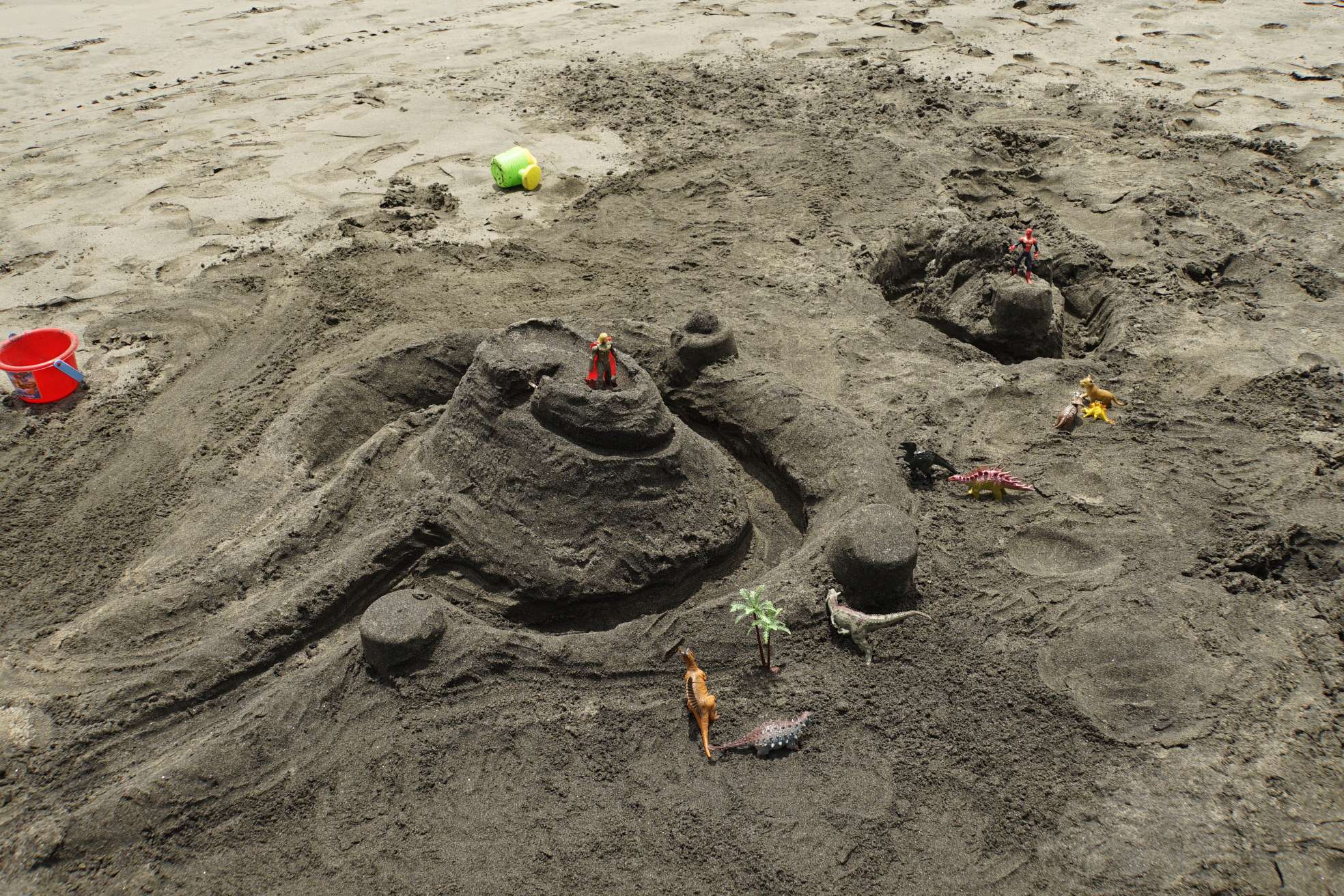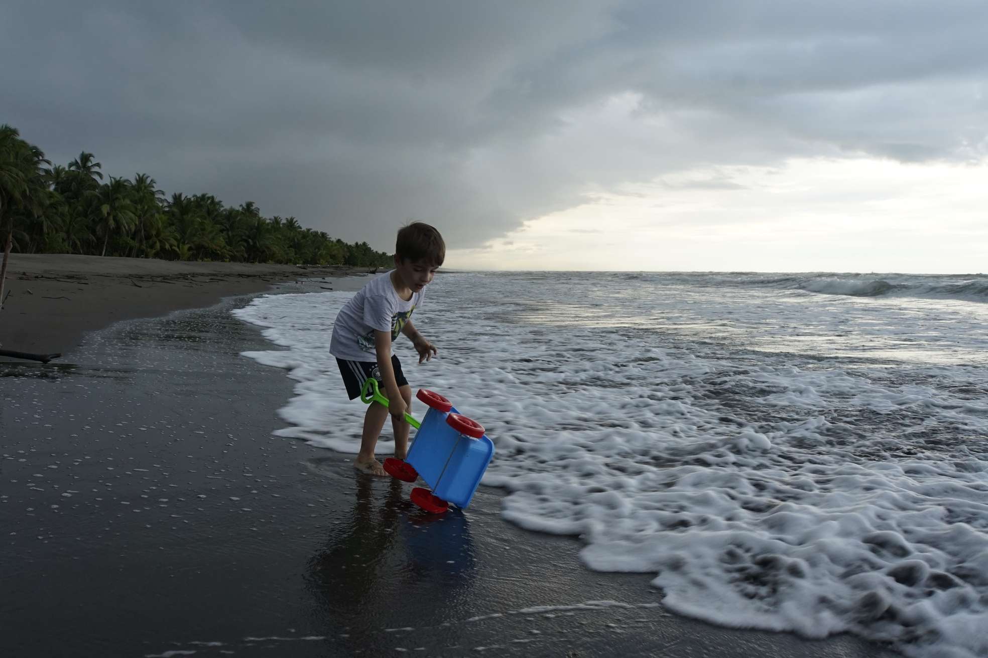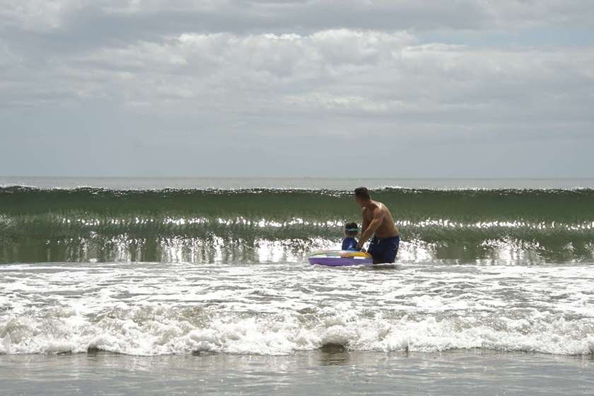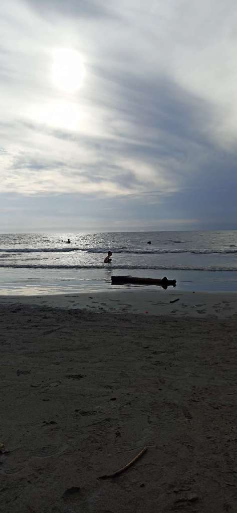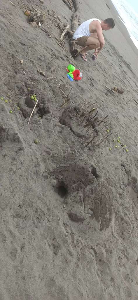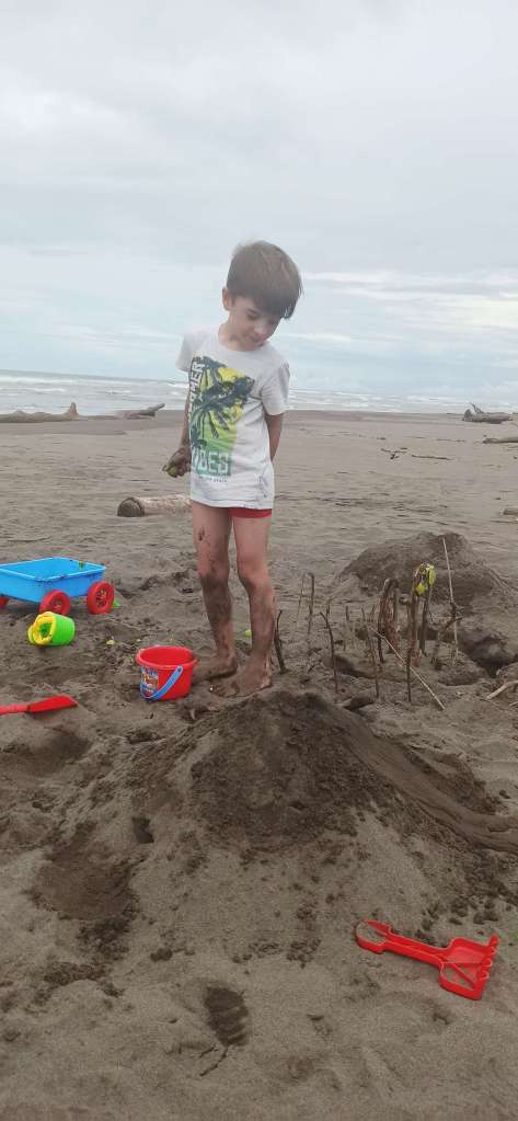 Es dauerte nicht lang, da sind die Nachbarsjungs dazu gekommen. Auch wenn keine Kommunikation stattfindet (außer zwischen Damian und mir so halb), fanden die Kinder es doch spannend mit uns „Ausländern“ abzuhängen. Also haben wir gemeinsam Sandburgen und Vulkane gebaut, haben Wellen besiegt und so weiter. Wir Spießerbürger in Badesachen, die Tico Kinder eben in Hose, T-Shirt und Co. Die Mama hat sich später sicher gefreut….haha.