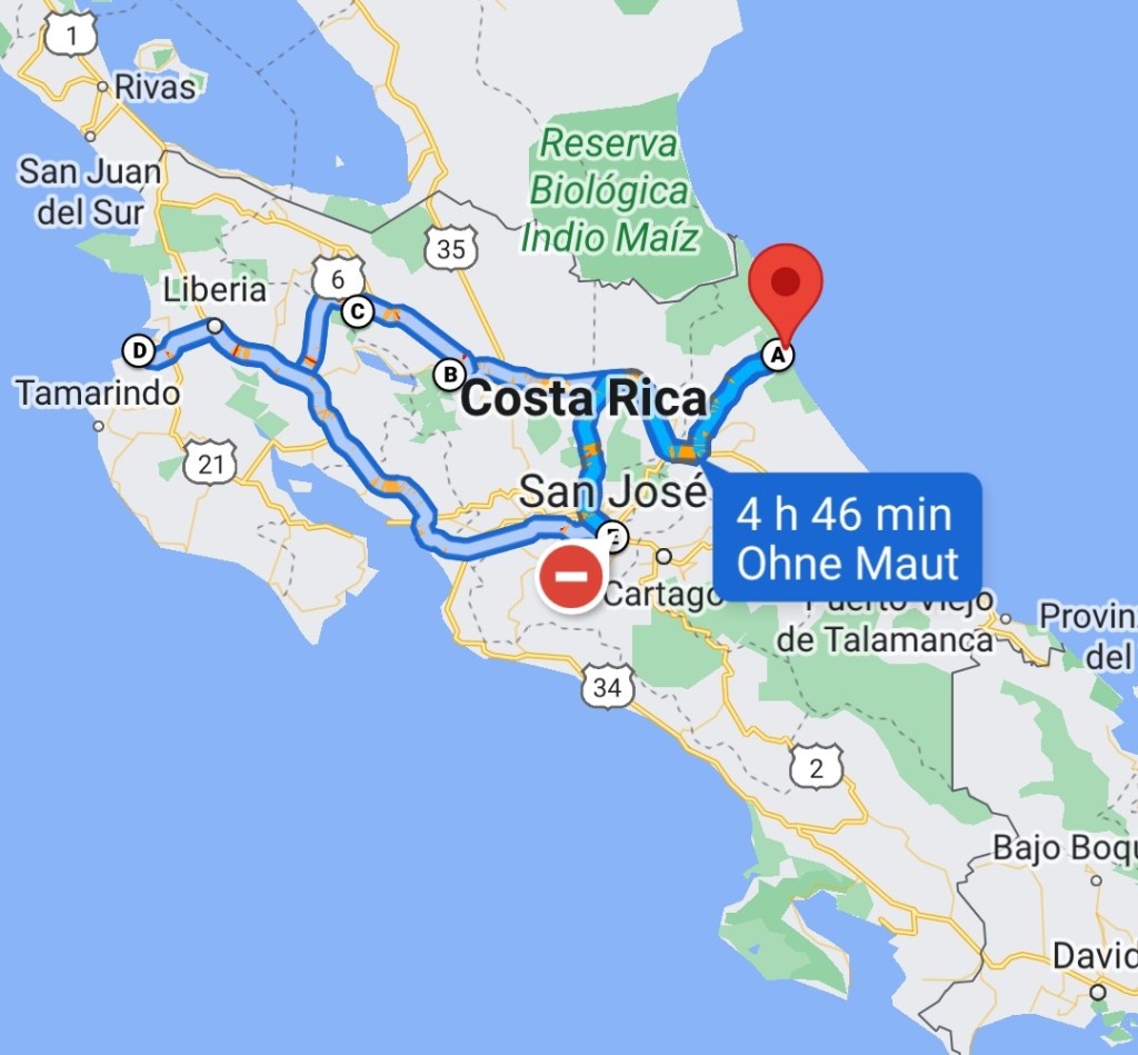 Unsere zweieinhalbstündige Fahrt nach Pavona, dem Ende der Straße vor dem Nationalpark, war wieder eindrucksvoll. Bei der Autovermietung haben wir natürlich nach den Gepflogenheiten und Geschwindigkeitsbegrenzungen gefragt und es scheint, dass niemand so genau weiß wie schnell wo gefahren wird. Wir fanden das amüsant und machten natürlich Witze darüber, dass man eben so schnell fährt wie Polizei vor Ort ist. Das fanden die Ticos auch witzig, denn es ist ganz anders. Zitat:
