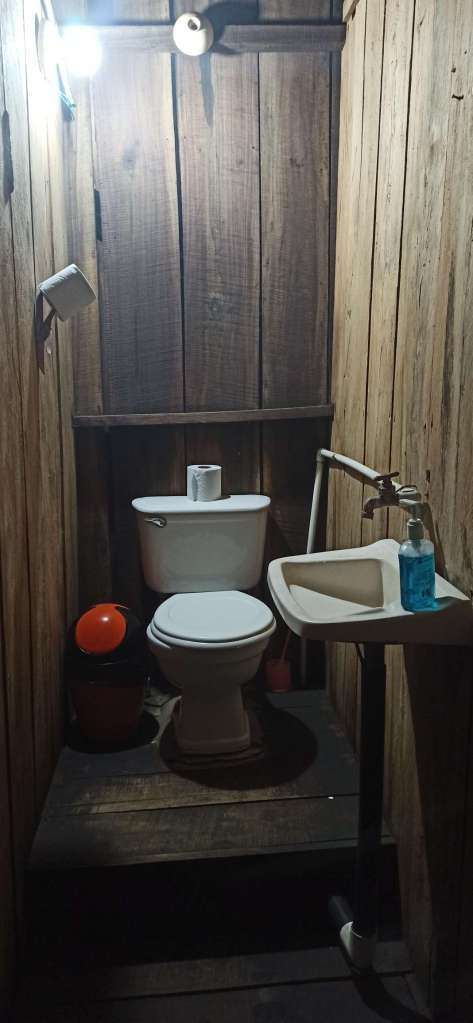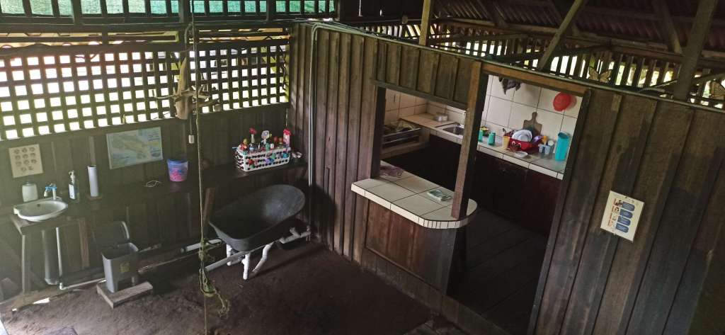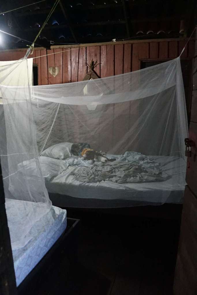 David zeigt uns also die rustikale Hütte. Wir sind auf Basic ohne Strom und ohne Internet eingestellt. Alles gut. Ich sehe jedoch an Marcos Gesicht wie er so gar nicht amused ist. Er fand es schrecklich. Und wenn er eins nicht kann, dann ist es Lächeln trotz Unzufriedenheit. 3 Nächte. Die Toilette lädt dazu ein nichts trinken zu wollen. Die Handtücher riechen so, als hätte man sie in Lack getaucht. Moskitonetze brauchen wir nicht „aah no hay muchos mosquitos aqui“. Ja genau, glaube ich sofort, dass es hier keine Moskitos in der Hütte gibt. Also zwei Netze bitte :-). Ohje ..das kann was werden. Zu unserem „Glück“ regnet es in Strömen, also ein „rauskommen“ scheint unmöglich. Ich gebe zu, wohlfühlen ist hier eine Wunschvorstellung für unsere Lebensverhältnisse. Dann hat Osman festgestellt, dass es auch in unserem „Zimmer“ rein regnet. Da war Marcos Begeisterung gleich noch ein wenig größer. Doch das wird schon. Wir sind im Regenwald, es wird großartig, es ist anders und es sind nur 3 Tage. Drei Tage, welche wir mit positivem vibe füllen werden. Oder?