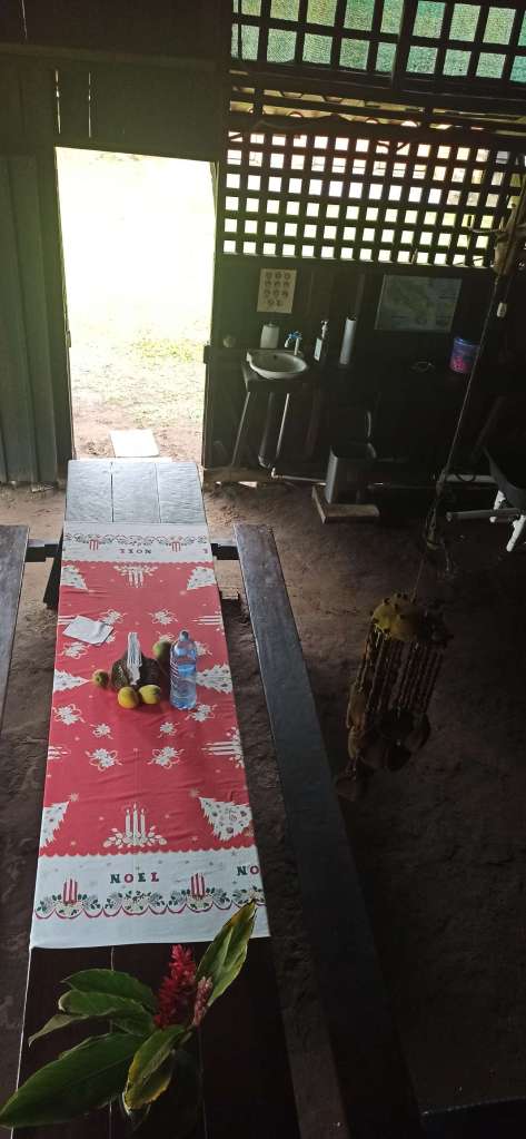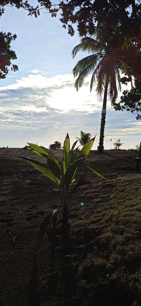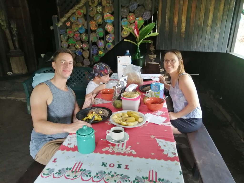 Die Nacht war zugegebenermaßen schrecklich. Es war laut (klar Urwald), schwitzig, eng (Ben wollte natürlich nicht in seinem Bett schlafen) und naja. Obwohl Wellengeräusche normalerweise wunderschön sind, hören sich die hier eher wie monotones Rauschen eines überdimensionalen Deckenventilators an. Meine Nacht war 4 Uhr vorbei. Aufgestanden sind wir kurz vor 6 Uhr. Der Gang zum Wasser war ein grandioser Start. Am Morgen um 6 schon im Meer zu baden ist ziemlich cool.