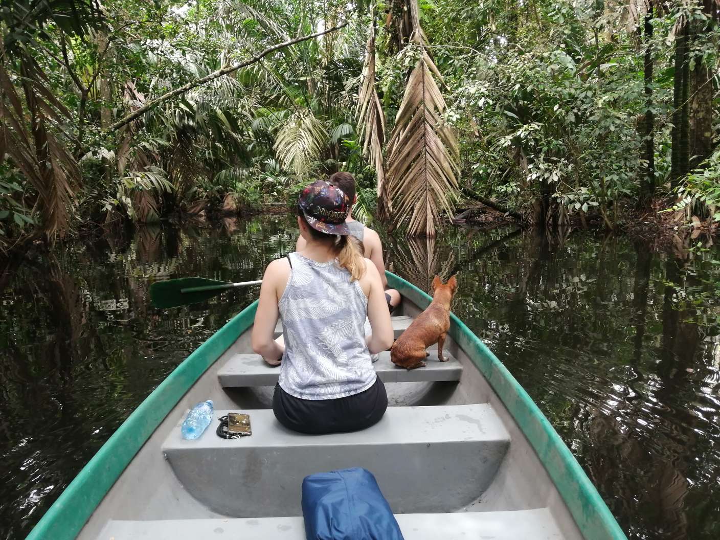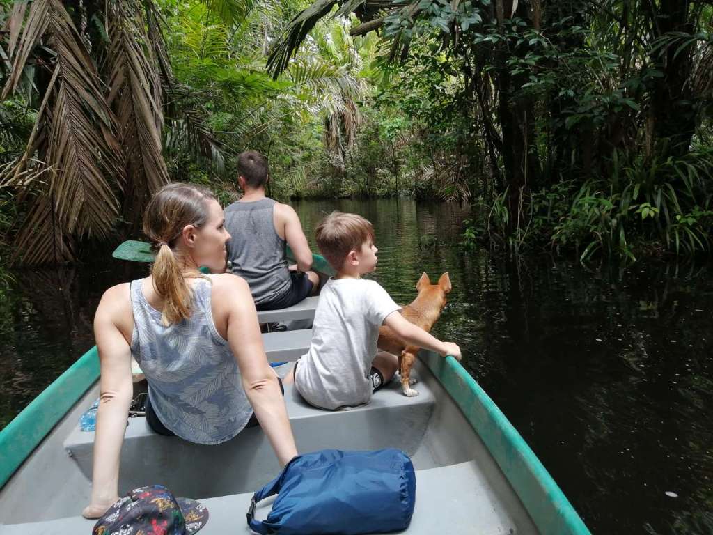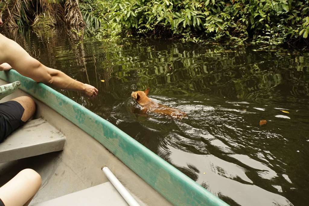 Nach einem reichhaltigen Frühstück beschließen wir eine Bootstour zu machen. David und Osman bereiten also das Boot vor, während wir uns zusammenpacken. Bislang ist es zwar bewölkt, aber nach Regen sieht es noch nicht aus. Nicht, dass man das so wirklich voraussagen könnte, aber es zeichnet sich ab, dass es eher ab dem frühen Nachmittag oder nachts regnet. 9.30 Uhr sind wir startklar und hieven das Boot zur Lagune, um in den Fluss zu setzen. Canello, der kleine Hund von David folgt uns. Und Leute, ich sage euch eins: dieser Hund ist crazy! Er hat uns die gesamten 2h begleitet – IM Wasser…hat die Affen zusammen gebellt …Leguane gejagt und so weiter. Erst die letzten 45 Minuten begab er sich dann doch zu uns ins Boot. Vielleicht ist ihm dann endlich in den Sinn gekommen, dass Kaimane nicht die besten Buddies im Wasser sind?!