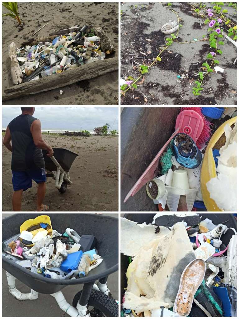 Dieses herrliche Wetter, später nahezu wolkenlos, hat uns nach der Tour wieder direkt ins Meer gelockt. Nunja, zumindest die Jungs. Denn ich hatte ein anderes Verlangen. Zusammen mit Osman haben wir uns seine selbstgebaute Schubkarre geschnappt und den Strand etwas vom Müll beseitigt. Es ist unfassbar, was und vor allem wie viel hier angeschwemmt wird. Auf nur etwa 50m Strand haben wir so viel Müll eingesammelt. Angeschwemmt wird der Müll maßgeblich von den karibischen Inseln wie Jamaika und Haiti. Wenig kommt von Costa Rica selbst, ein Land welches extrem nachhaltig ist – vor allem im Vergleich zu all anderen Nord- und südamerikanischen Ländern. Es ist wirklich sehr traurig und bitter mit anzusehen, wie die Meeresschildkröten, welche hier ihre Ablageorte haben, durch den Müll kriechen müssen.