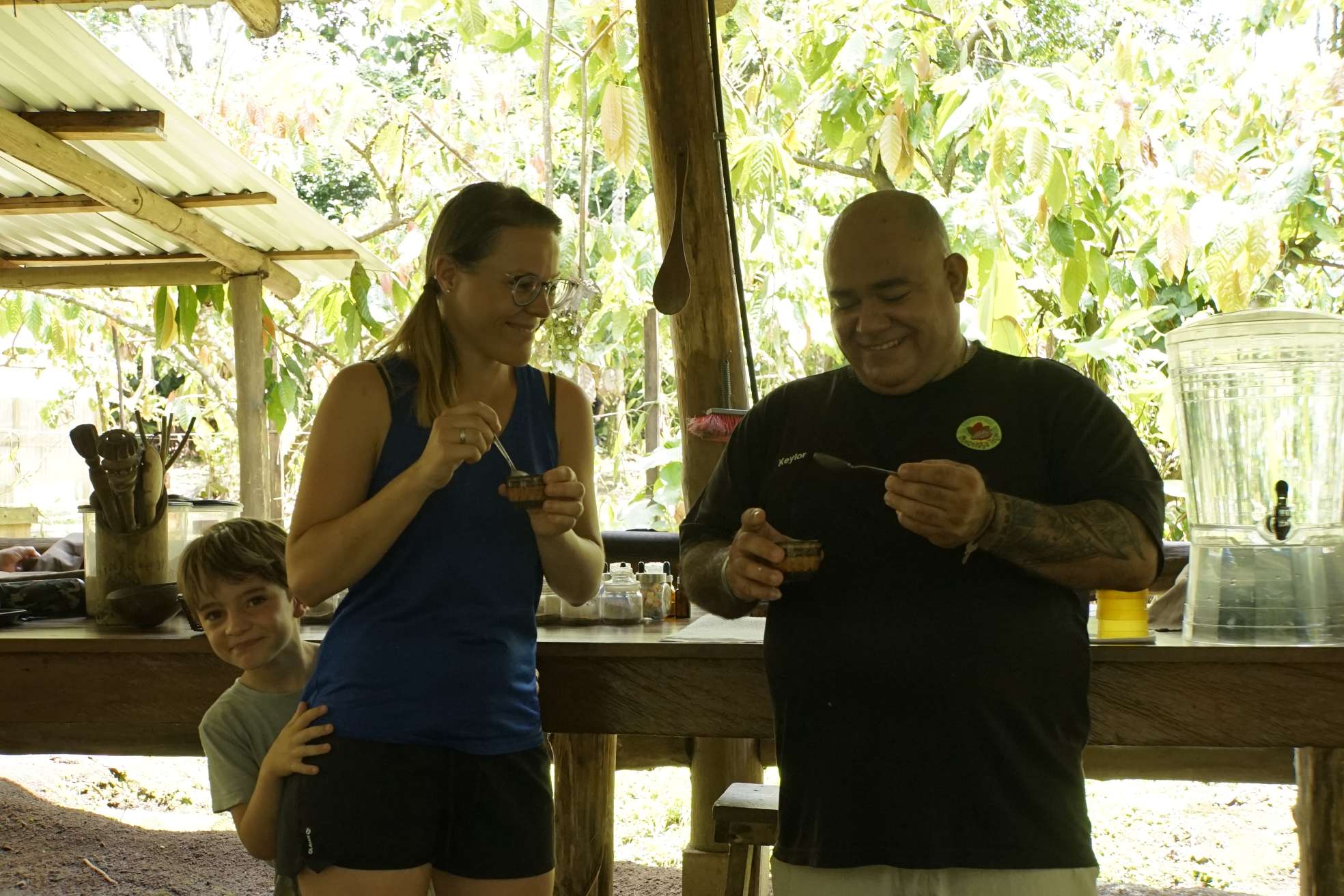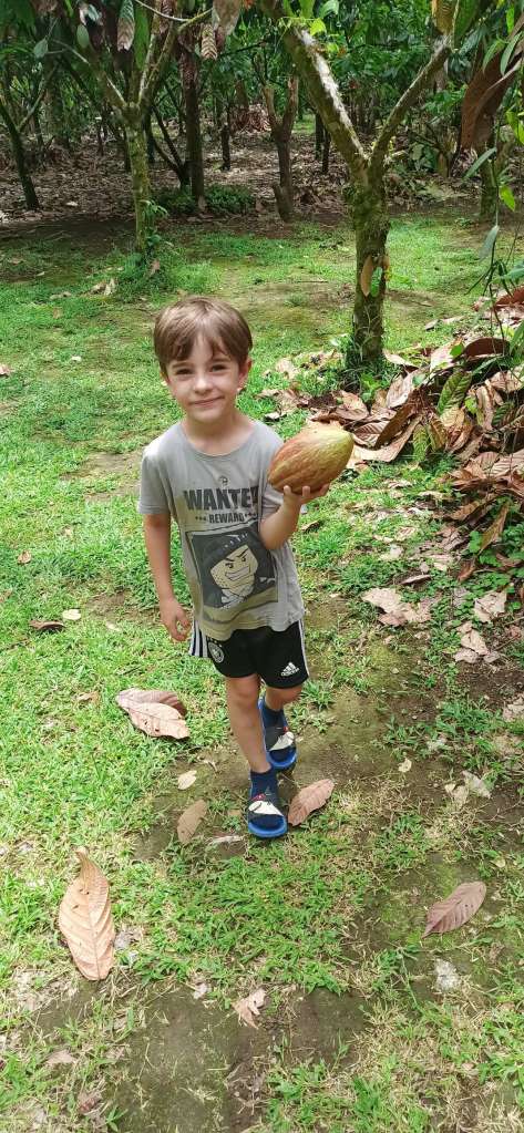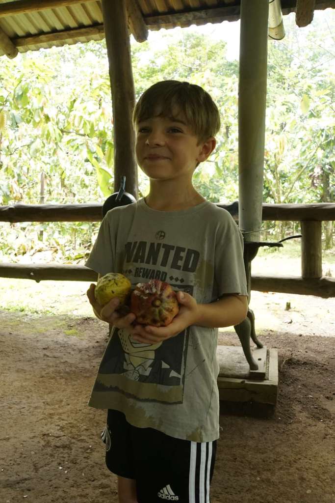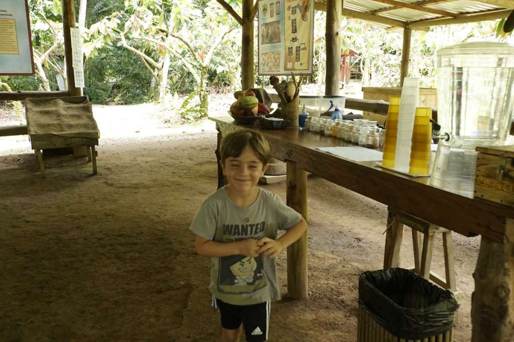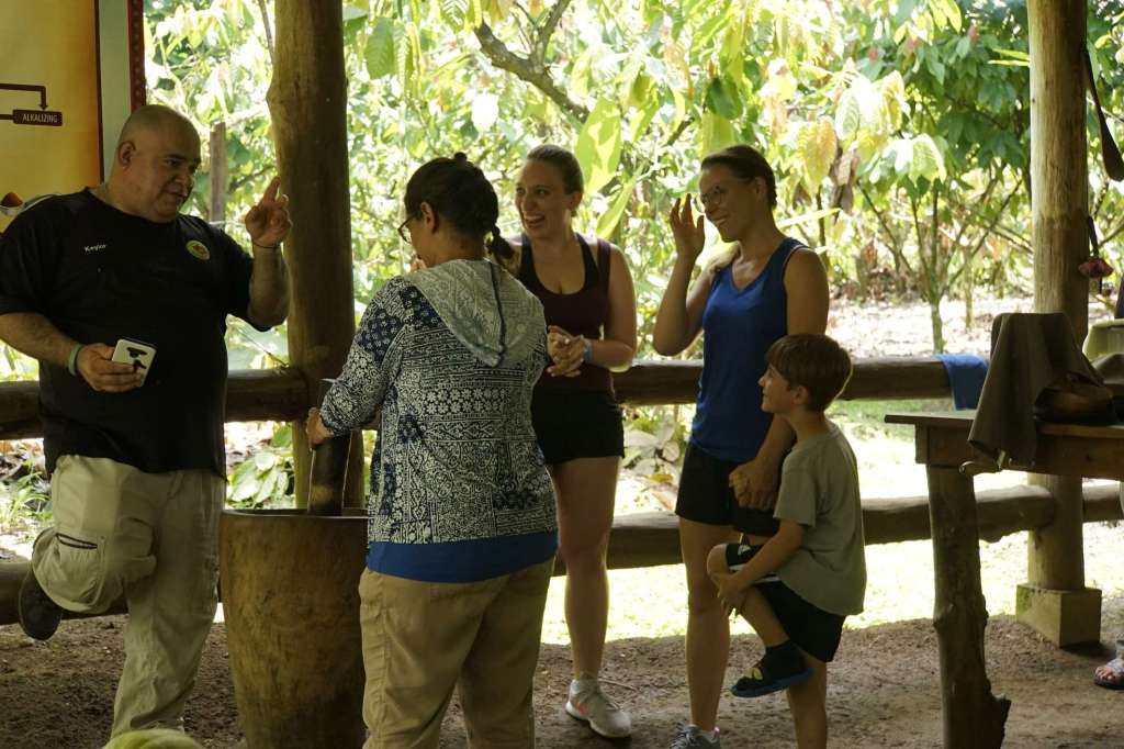 Unser Guide Keylan war der Knaller. Er war Ironie in Person (das ist mir sehr sympatisch), er stänkert gerne (auch sympathisch) und seine Mimik übertrifft alles. Er war einfach so lustig, ich hatte am Abend Muskelkater in den Wangen (vom Lachen, nicht vom Schokolade essen ;-) ). Zu Beginn hat er natürlich ziemlich viel darüber erzählt was Schokolade ist, wie und wo Kakao entdeckt wurde bis hin zu den riesigen Schokogiganten (Mars, Hersheys……) und deren kriminellen Machenschaften. Ben hat kein wort verstanden, so war es für ihn anfangs langweilig. Doch als wir durch die Plantage gingen, konnte er zwei Kakaoschoten ernten und danach ging der Spaß erst so richtig los. Wir haben Bohnen in jeder Form (roh, fermentiert, geröstet) gerochen und teilweise probiert. Danach haben wir Bohnen gemahlen, Kakaopaste, einen Azteken-Schoko-Drink hergestellt, Schokolade verkostet und….getanzt. Auch Ben und ich haben sich zum Affen gemacht. Es war wirklich so so so lustig…. Ben fand es total abgedreht und der Keylan war definitiv das Highlight schlechthin. Achso, und die Schokolade…war ziemlich lecker! Ben hatte danach Bauchschmerzen, also könnt ihr euch denken wie oft er zugeschlagen hat.