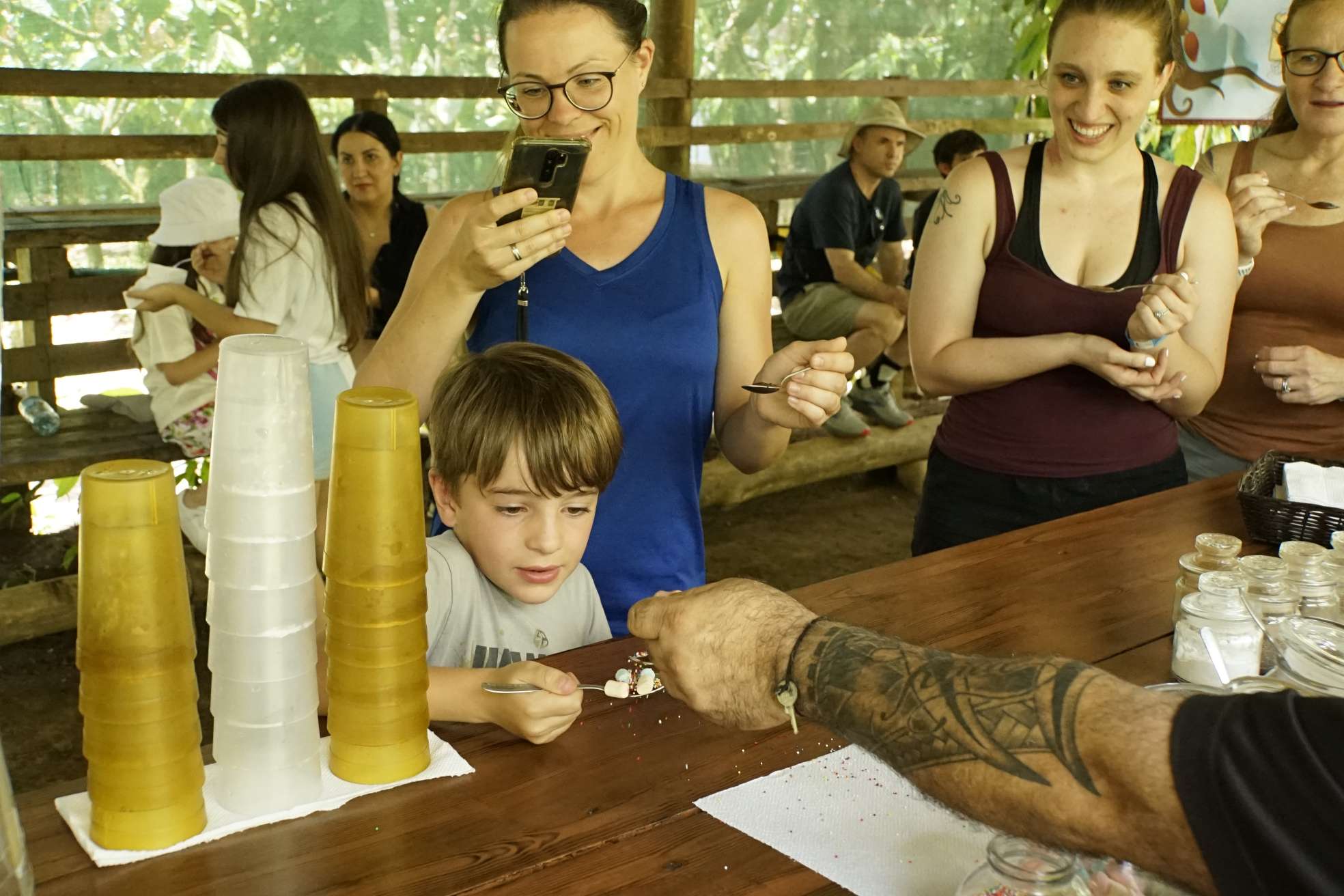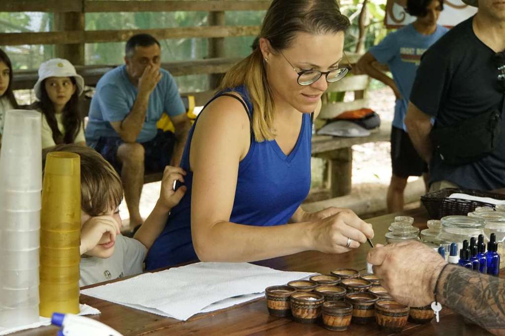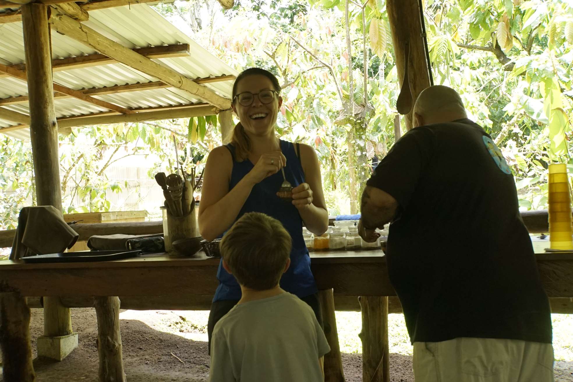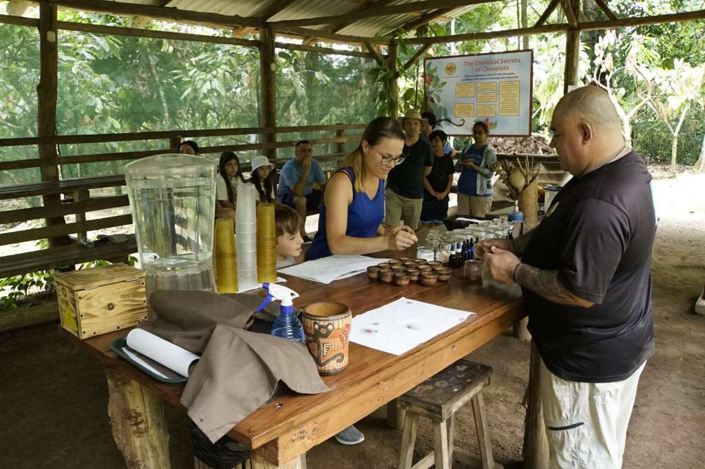 Unser Guide Keylan war der Knaller. Er war Ironie in Person (das ist mir sehr sympatisch), er stänkert gerne (auch sympathisch) und seine Mimik übertrifft alles. Er war einfach so lustig, ich hatte am Abend Muskelkater in den Wangen (vom Lachen, nicht vom Schokolade essen ;-) ). Zu Beginn hat er natürlich ziemlich viel darüber erzählt was Schokolade ist, wie und wo Kakao entdeckt wurde bis hin zu den riesigen Schokogiganten (Mars, Hersheys……) und deren kriminellen Machenschaften. Ben hat kein wort verstanden, so war es für ihn anfangs langweilig. Doch als wir durch die Plantage gingen, konnte er zwei Kakaoschoten ernten und danach ging der Spaß erst so richtig los. Wir haben Bohnen in jeder Form (roh, fermentiert, geröstet) gerochen und teilweise probiert. Danach haben wir Bohnen gemahlen, Kakaopaste, einen Azteken-Schoko-Drink hergestellt, Schokolade verkostet und….getanzt. Auch Ben und ich haben sich zum Affen gemacht. Es war wirklich so so so lustig…. Ben fand es total abgedreht und der Keylan war definitiv das Highlight schlechthin. Achso, und die Schokolade…war ziemlich lecker! Ben hatte danach Bauchschmerzen, also könnt ihr euch denken wie oft er zugeschlagen hat.
