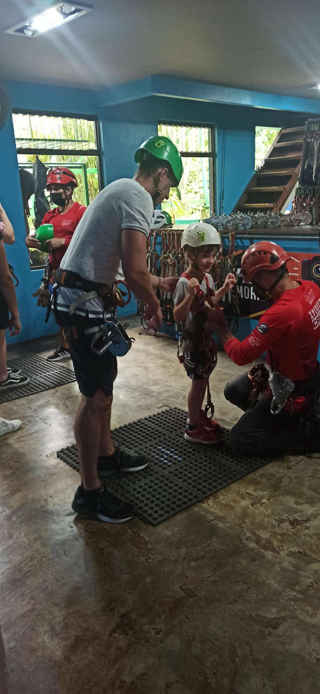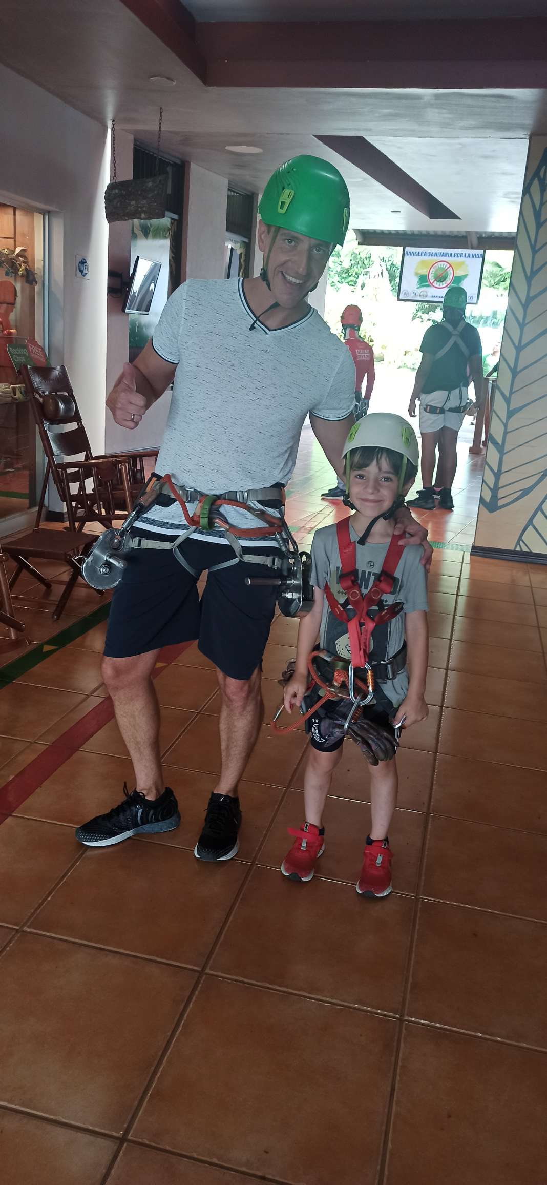 Ein Abenteuer wollen wir uns gönnen. Also begebe ich mich auf die Suche. Ziplining mit Kind ist allerdings eine Herausforderung. Ich habe zwei Anbieter gefunden: Ecoglide und Sky Adventures (dies ist auch die bekannteste Company, welche in La Fortuna und Monteverde einen Standort haben). Bei den meisten Anbietern heißt es ab 8 oder 1,35m. Vermutlich haben die weniger Personal oder wie auch immer. Bei Sky Adventure waren so viele Mitarbeiter überall, dass man sich richtig gut betreut gefühlt hat und vor allem haben sie immer auf Ben acht gegeben. Preislich ist der Unterschied 10€, bei 250€ macht das dann aber auch keinen Unterschied mehr… Als Ben gesehen hat, wie hoch die Zipline ist, meinte er: