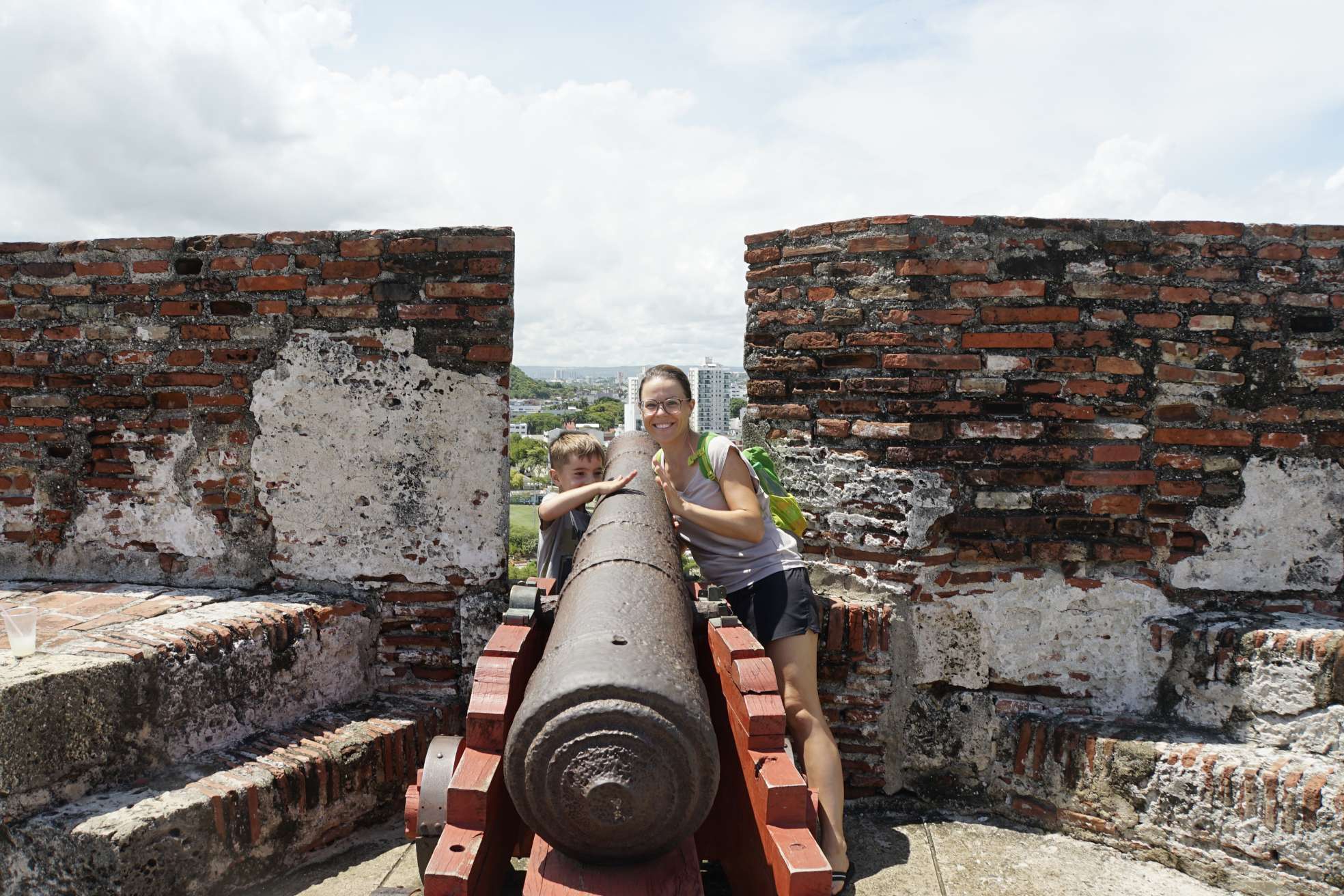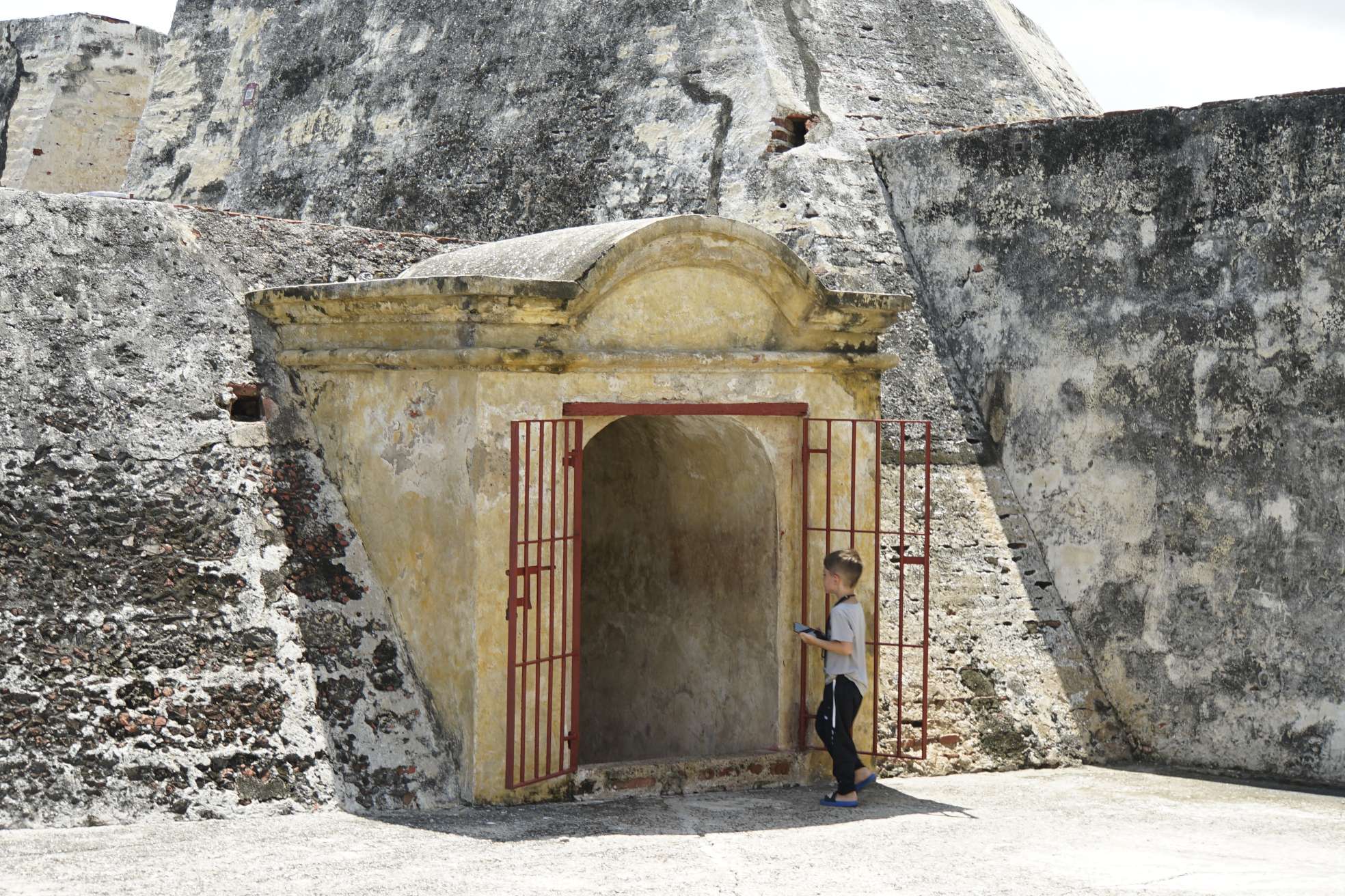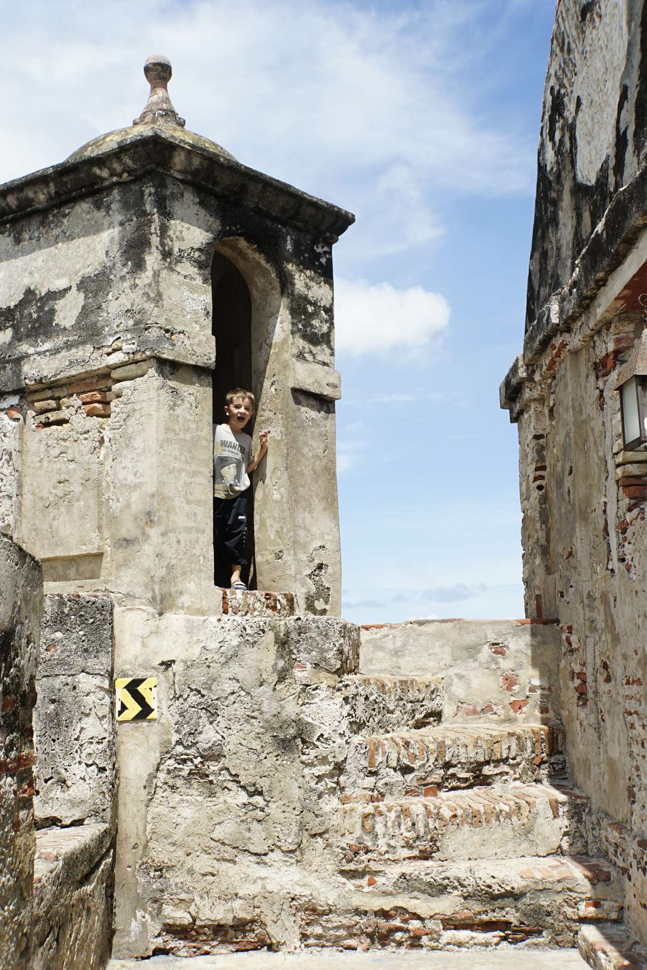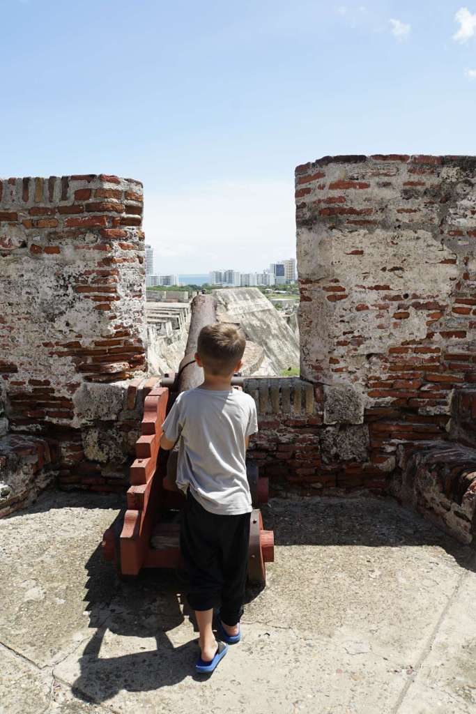 Mensch, zum Glück haben wir das 2-Tages-Ticket des Busses… also geht’s heute ,direkt nach dem Frühstück, mit dem Taxi zum Castelo de Felipe. Kaum dort angekommen, werden wir auch schon von Verkäufern belagert und von einem sogar verfolgt. Doch an der Kasse zum Eingang gibt es eine Absperrung und, wie immer, auch Polizisten. Da haben wir dann unsere Ruhe – juhuu. Die Burg ist ziemlich cool und hat sogar, unterirdische Gänge, die Ben besonders gut gefallen. Es ist soooooo heiß….und schwül. Ben und ich laufen förmlich aus. Der Regenschirm erweist sich als bester Begleiter.