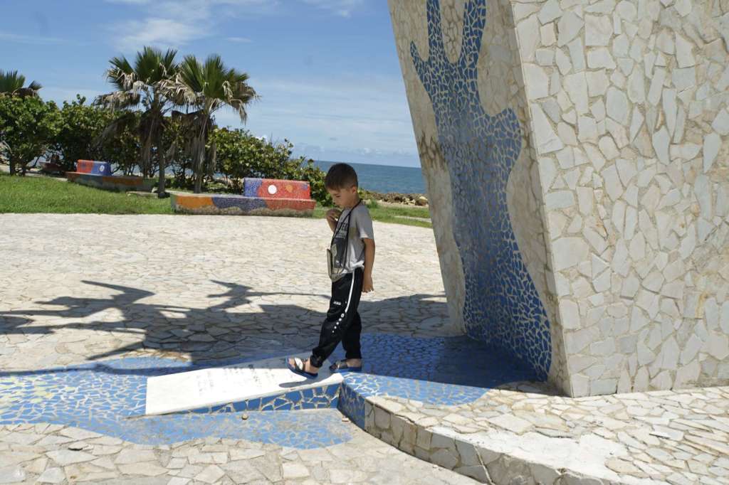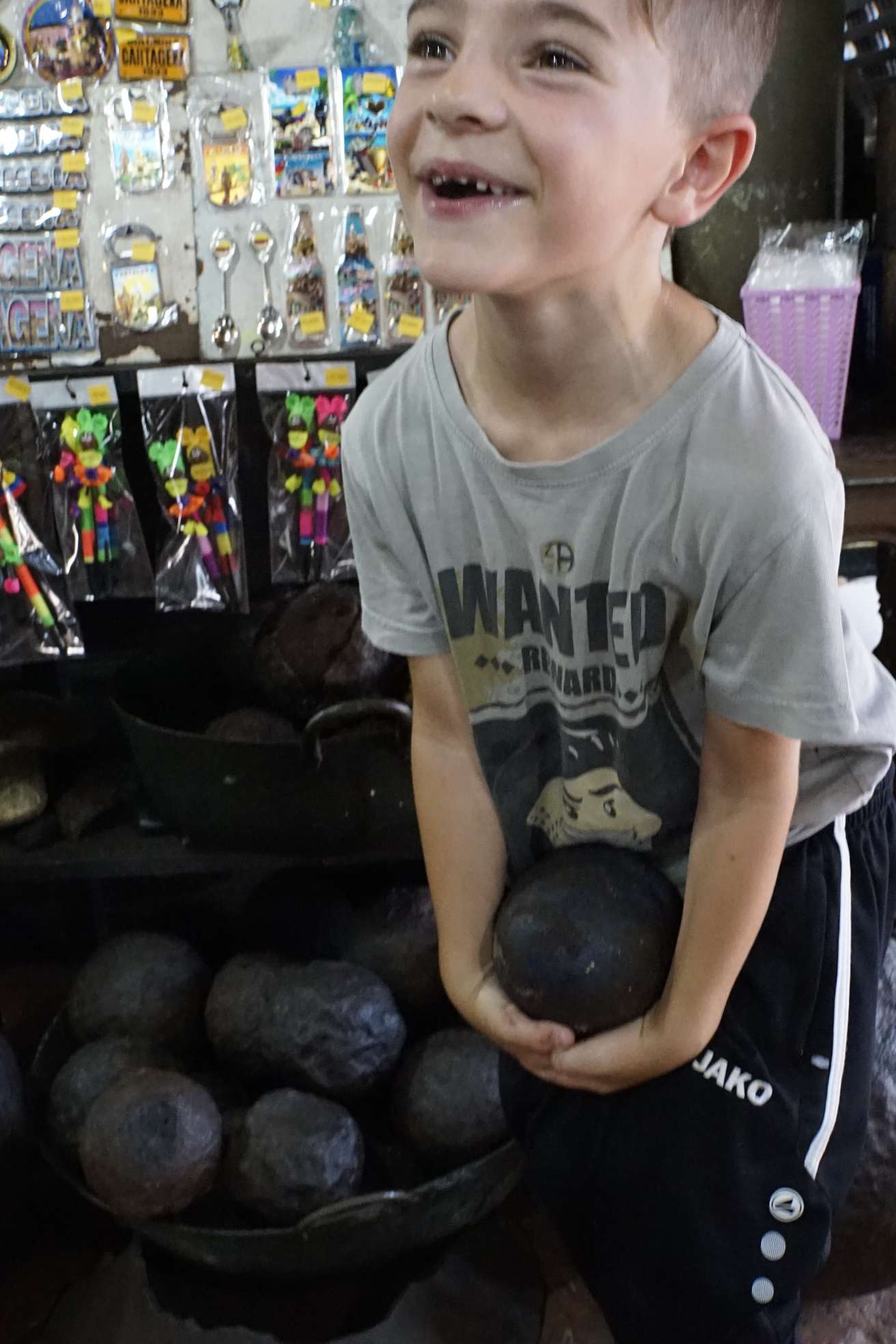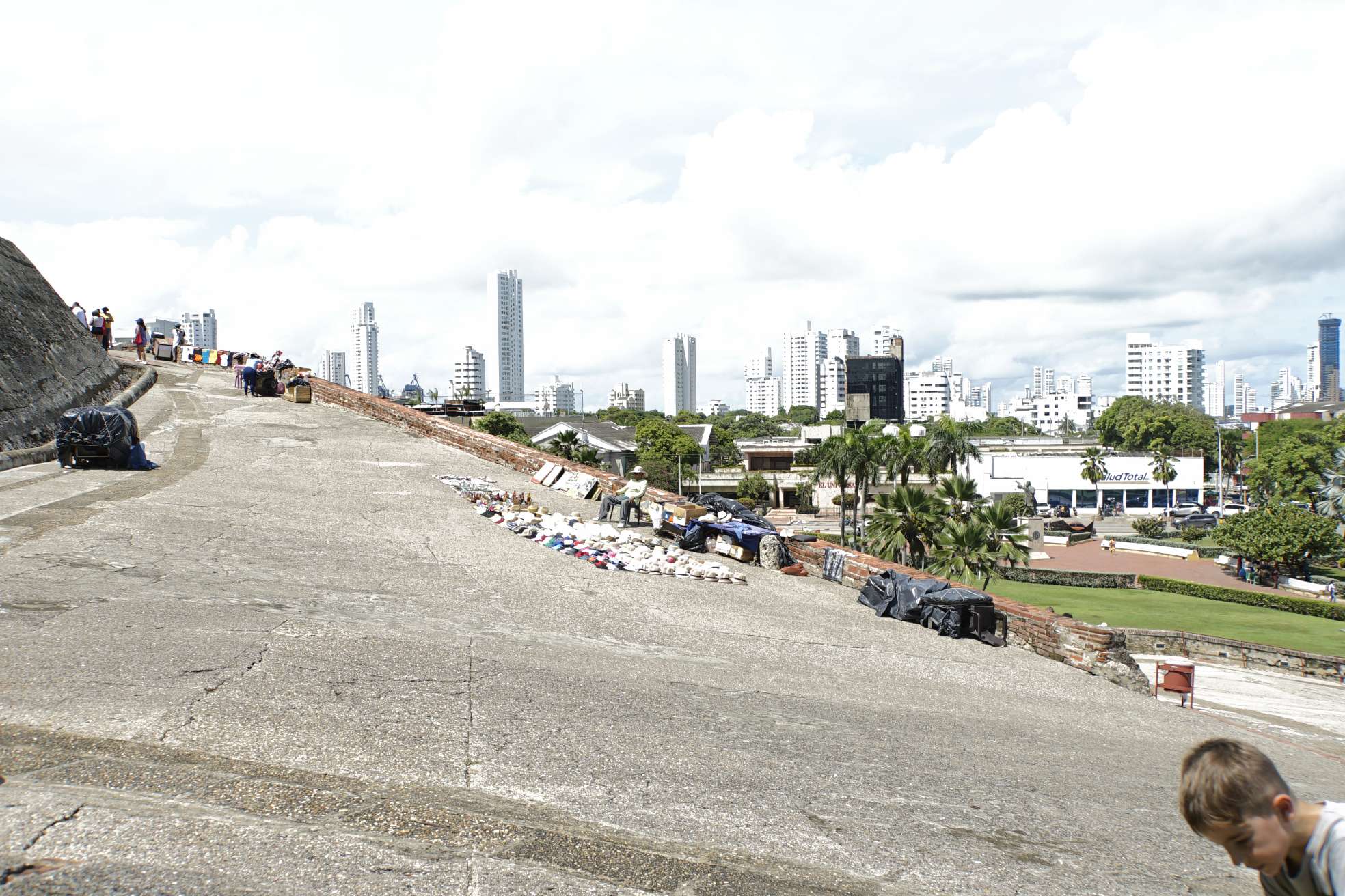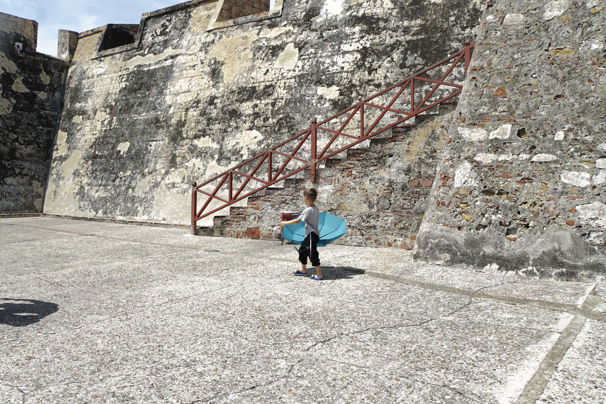 Mensch, zum Glück haben wir das 2-Tages-Ticket des Busses… also geht’s heute ,direkt nach dem Frühstück, mit dem Taxi zum Castelo de Felipe. Kaum dort angekommen, werden wir auch schon von Verkäufern belagert und von einem sogar verfolgt. Doch an der Kasse zum Eingang gibt es eine Absperrung und, wie immer, auch Polizisten. Da haben wir dann unsere Ruhe – juhuu. Die Burg ist ziemlich cool und hat sogar, unterirdische Gänge, die Ben besonders gut gefallen. Es ist soooooo heiß….und schwül. Ben und ich laufen förmlich aus. Der Regenschirm erweist sich als bester Begleiter.