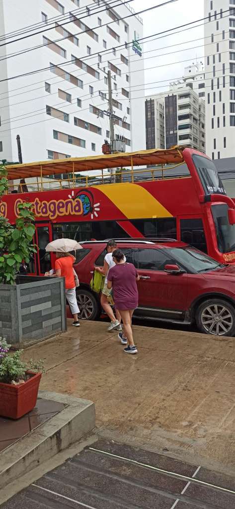Nachdem wir eine SIM-Karte im Caribe Plaza organisiert haben, fahren wir nach Bocagrande. Dort ist die Hauptstation für die „Hop-On-Hop-Off“- Busse. Für uns doch eine gute Möglichkeit, einen Überblick über die Stadt zu bekommen. Ich habe mich natürlich online zwecks der Tickets informiert. Da kam Nummer 1 der kolumbianischen Masche: zur Zeit verkaufen wir keine 1-Tages-Tickets, sondern nur die 2-Tages-Tickets. Na klar… Dann nehmen wir wohl das 2-Tages-Ticket. Wie sich eine halbe Stunde heraus stellen sollte, war das nicht so unglücklich. Denn es begann zu regnen. Kein normaler Regen. Es war eine reine Sturmflut. Es regnete in den Bus, vom oberen Deck ins untere Deck. Ein Wasserfall strömte die Treppe hinunter. Es regnete aus der Klimaanlage (ich hoffe jedenfalls, dass es Regen war). Ich habe bisher noch nie solch geflutete Straßen gesehen. Wasser stand teilweise bis zu den Knien und das nach nur 1h Regen. Es machte keinen Sinn. Wir fuhren also nur die Hälfte der Tour und stiegen an einer Haltestelle aus, um nach Hause zu fahren. Morgen ist auch noch ein Tag.