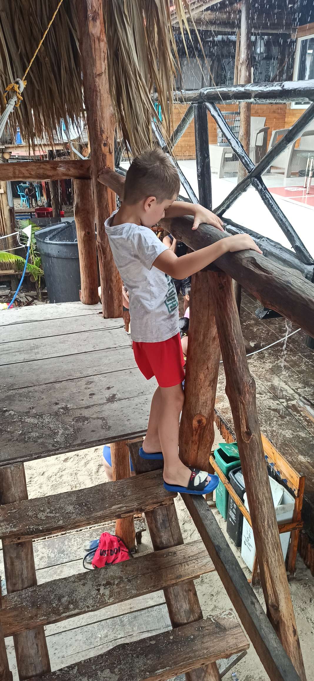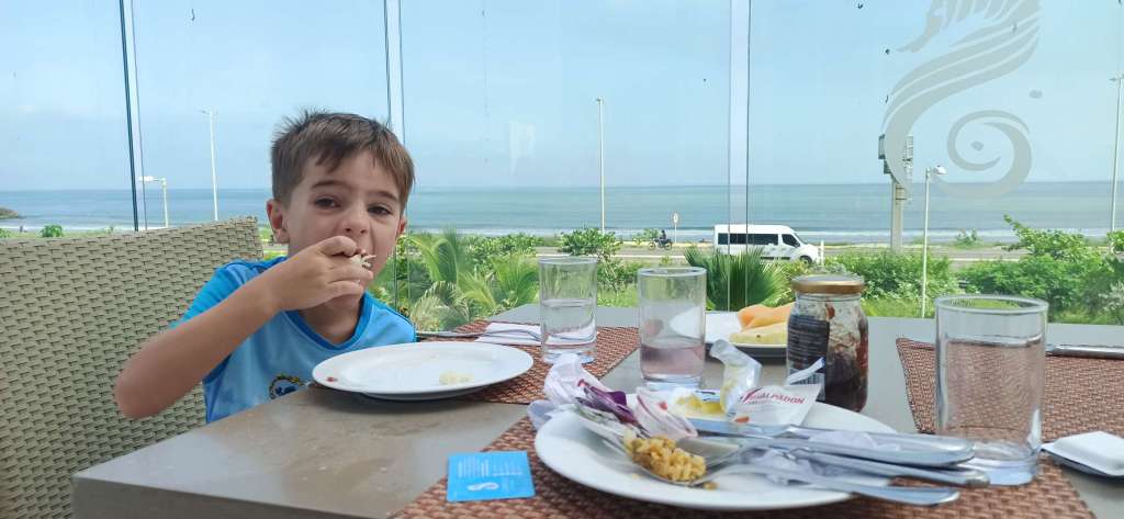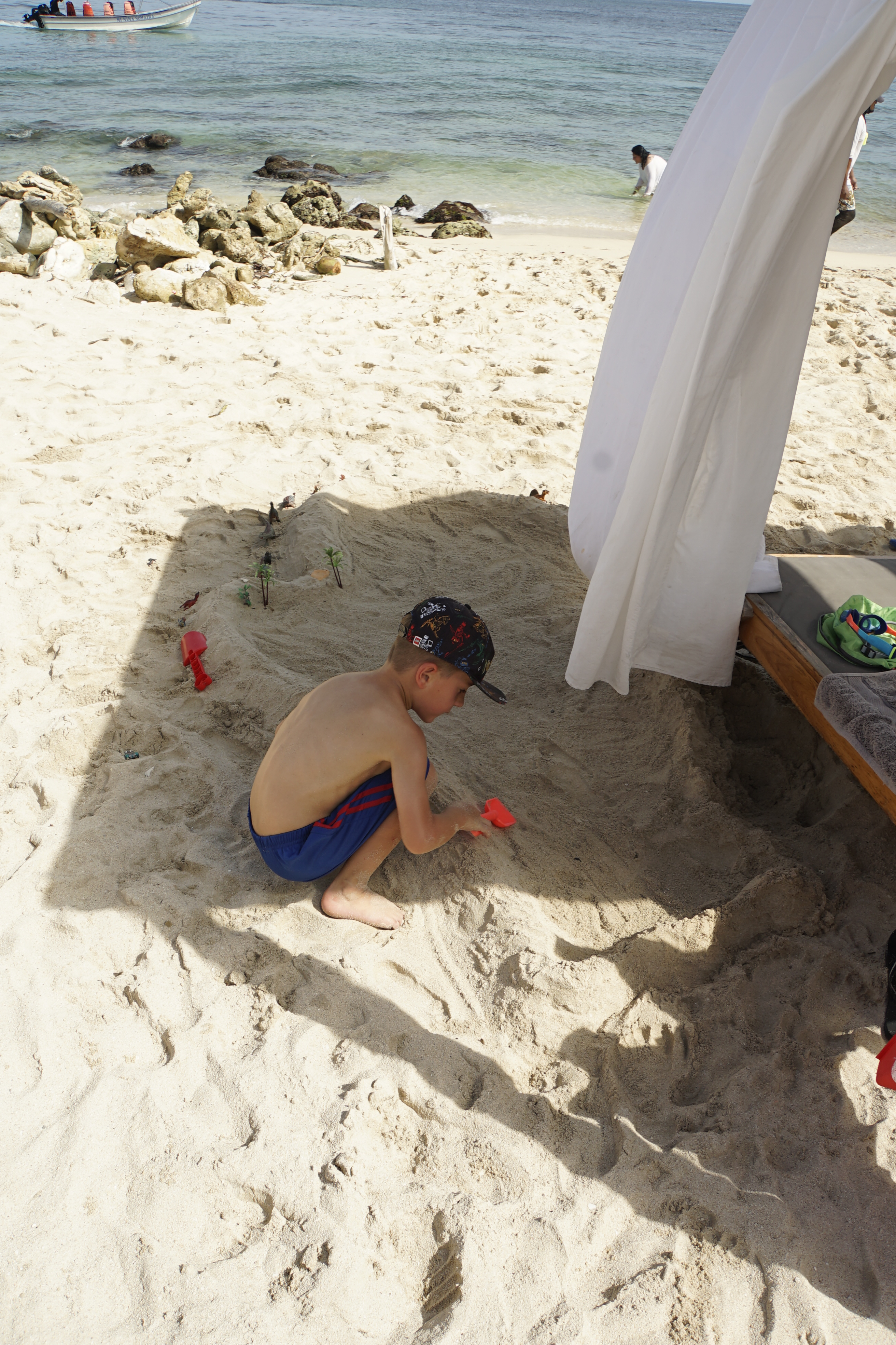 Da waren wir also und mussten bis 14.30 die Zeit „rumkriegen“. Es reihte sich eine Hütte neben die nächste. Jeder verkaufte das Gleiche, jeder hatte seine Strandliegen oder Betten davor zu stehen, welche man nutzen konnte. Also suchten wir uns eine und haben beschlossen , das Beste daraus zu machen. Ehrlich! Das war unser Plan. Aber der Tag wurde nicht besser. Ben fing an zu buddeln, eine kleine Dinoburg zu bauen. Doch alle 3 Minuten kam ein Verkäufer (oder anderer Gast), und ist -obwohl Ben offensichtlich baute – drüber getrampelt. Er hat so bitterlich geweint. Und es tat mir so leid, dass ich gleich mit geweint habe. Was stimmt mit den Leuten hier nicht? Ich baute ihm also eine Begrenzung aus Schuhen und anderen auffälligen Dingen und hoffte, dass der Nächste Augen im Kopf hat (und sie auch benutzt). Okay, das funktionierte. Eine Stunde später hat Ben sich den rechten Fuß aufgeschnitten (Müll sag ich nur…). Dann begann es zu regnen. Dann gab es Mittagessen – Lichtblick. Der Fisch war auch sehr lecker, das muss man den Köchen lassen! Ben musste mittendrin auf die Toilette, also gingen wir. Als wir zurück kamen, war unser Essen weg. Echt jetzt? Wir beschlossen, einfach baden zu gehen und irgend etwas zu genießen. Doch es stank einfach überall nach Benzin. Die Boote und Jetski fuhren ohne Pause ca. 20m vom Ufer entfernt hin und her. Sie versuchen sich zu bewerben und rufen immer wieder Preise zum Strand. Während der letzten 4 Stunden haben auch meine Nase und Ohren dicht gemacht – klasse. Die Verkäufer kommen im Minutentakt und die Masseure sind die krassesten. Da greifen die sich einfach meinen Fuß und fangen an irgendwas zu säuseln und lassen mich nicht in Ruhe. What? Hier lernt man, dass man so richtig unfreundlich sein muss, damit sie einen in Ruhe lassen. Sehr schade.
