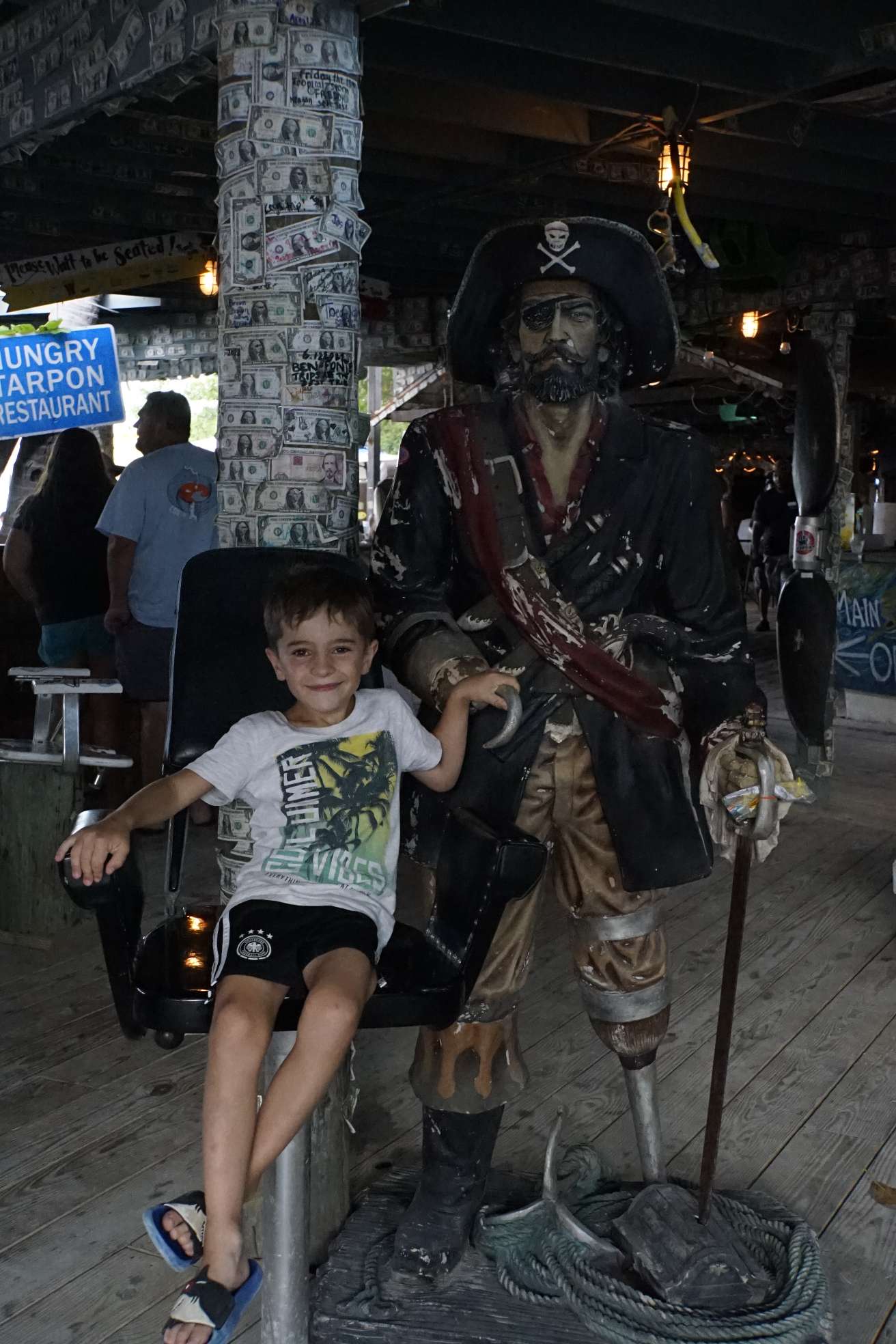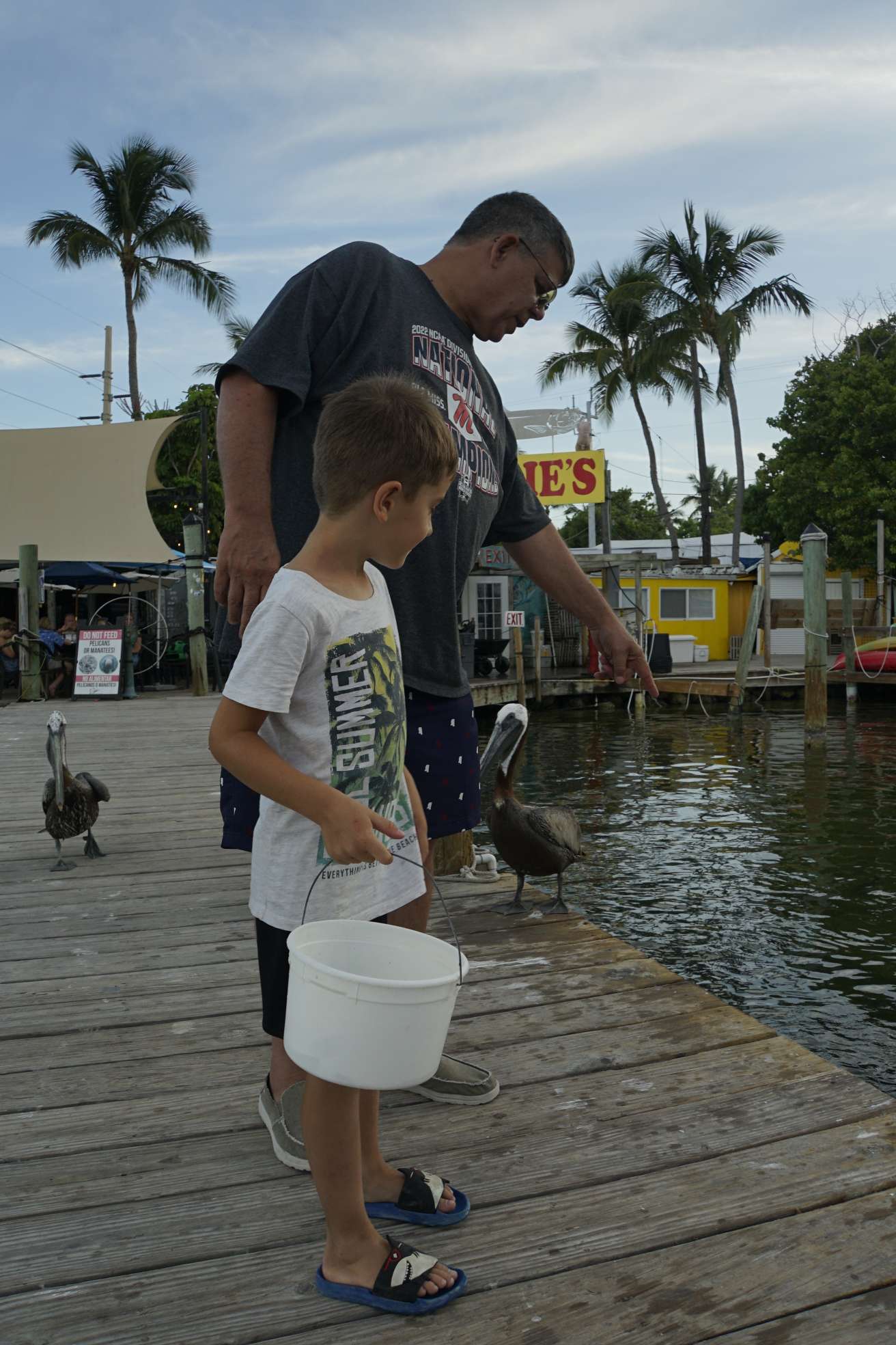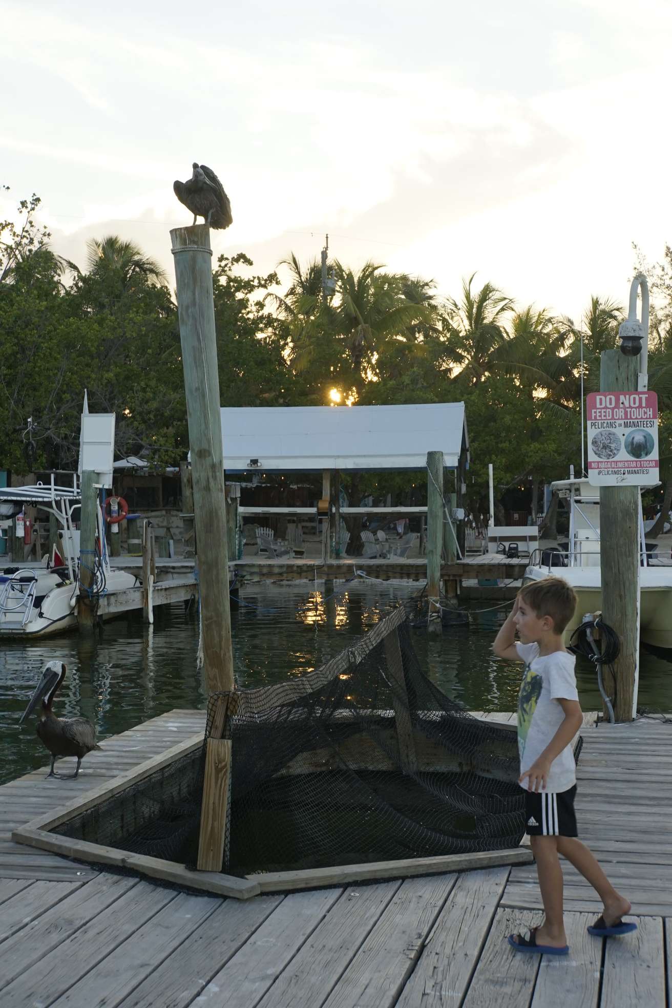 Nach dem Abendessen kam dann eines von Ben’s Highlights. Wir fuhren zu Robbies Islamorada, wo man Tarpune füttern konnte. Außerdem kommen hier auch jeden Abend Haie vorbei, oft tagsüber Seekühe. Wir hatten leider nicht das Glück diese zu sehen. Dafür war es umso lustiger, wie die Pelikane immerzu Ben beklaut haben. Einmal haben sie einen Fisch direkt aus dem Eimer gemopst und zweimal im Sturzflug aus der Hand geklaut, als er gerade die riesigen Tarpune füttern wollte. Das Gesicht hättet ihr sehen sollen. Ein war ein Bild für die Götter…Die Pelikane sind aber auch echt krass. So richtig mutig-angriffslustige und hinterlistige Vögel. Dennoch finden wir sie voll cool und haben sie oft beihnahe stundenlang in Costa Rica und Kolumbien beobachtet. Einfach weil, sie so coole Manöver starten.