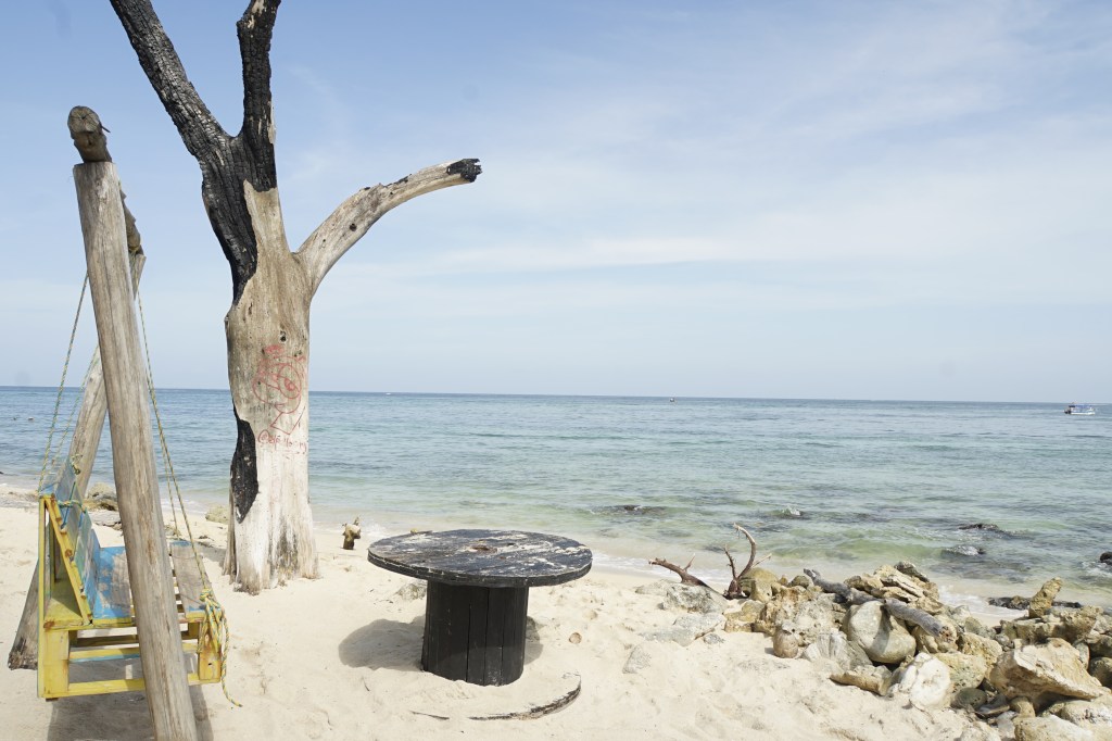 Ich verfolge auf Google Maps, dass wir in Richtung Playa Blanca abbiegen und bin irritiert. Ich google und zoome rein und was sehe ich da? Das kann nicht wahr sein. Es gibt einen zweiten Playa Tranquila……genau neben dem Playa Blanca. Meine Laune sinkt so tief, dass der Mariannengraben dagegen ein Witz ist. Hier sind wir also. An dem Ort, an den ich auf gar keinen Fall wollte. Wir steigen aus, laufen durch das Gewimmel von Verkäufern, vorbei an Müllbergen hinter zum Wasser. Dort steigen wir in ein Boot, um 2 (!!!!!) Minuten mit dem Boot zu fahren. Playa Tranquila = Playa Blanca, so eine Verarsche ist echt grenzwertig. Man hat unseren Mitreisenden die Laune ebenfalls angesehen. Der Playa Tranquila, den ich bei google gesehen habe, war 5km weiter südlich…fernab des Trubels.