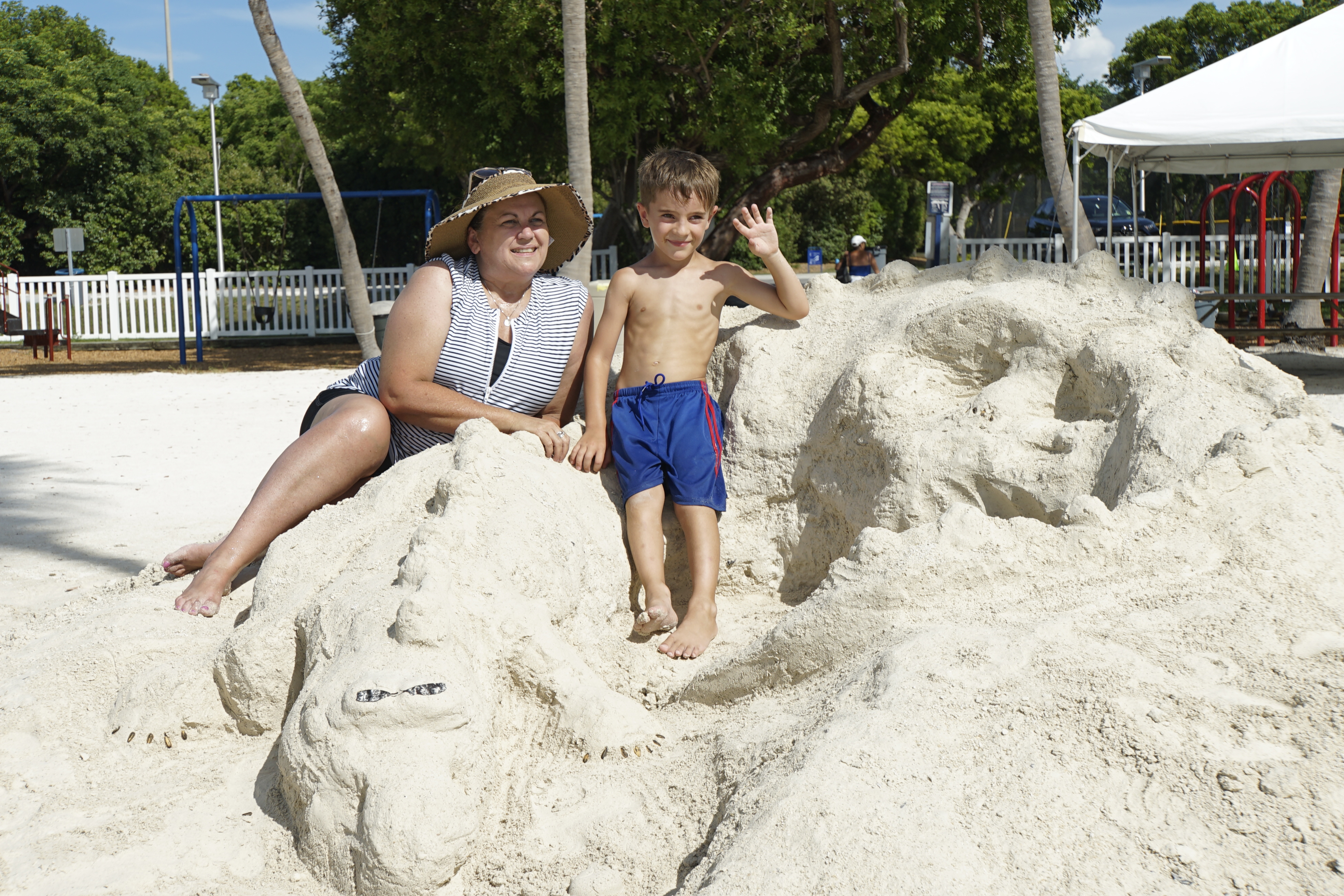 Wir verbrachten einen Großteil der Zeit in einem Park mit Strand. Das Wasser hatte allerdings eine höhere Temperatur als die Außentemperatur. Das war doch schon etwas merkwürdig. Ben entdeckte einen großen festen Sandhügel und wir fingen an zu bauen. Eine Burgmauer -dachte ich. Dann kam Deanna dazu und meinte: „Wow cool! You’re building a croc!“ What? Ein Krokodil? Ben und ich gingen ein Schritt zurück und siehe da. Es sah tatsächlich ein wenig so aus, als würde ein Krokodil auf dem Hügel sitzen. Okay dann bauen wir wohl ein Krokodil. Naja eigentlich eher Deanna, denn die hatte es voll drauf. Ben war am Ende ziemlich stolz drauf und Deanna wäre nicht Deanna, wenn sie nicht aus allem ein Photoshooting machen würde.. also mussten Bubba, und später andere Strandbesucher, eben ran an die Arbeit…haha.