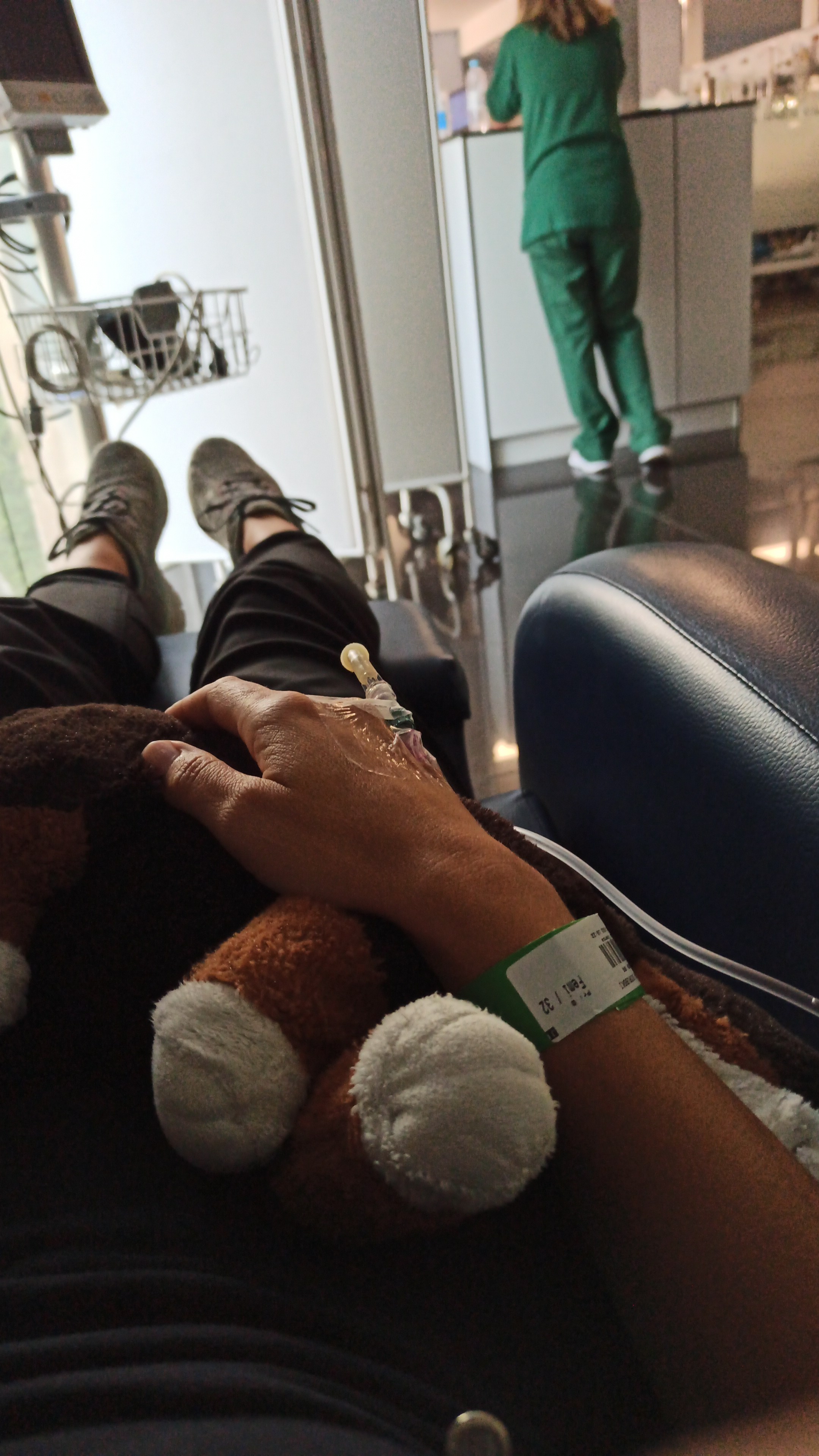 Den Flug, auf welchem wir beide nur 2 Stunden geschlafen haben, verging irgendwie und wir landeten in Lissabon. Ich könnte heulen, so furchtbar fühlte sich mein Ringen um Luft an. Schließlich tat ich es auch und eine Frau kam, um uns zu fragen ob sie mir helfen kann. Ben tat mir so leid, der versuchte mich außerordentlich süß zu trösten und Mut zu zureden. Ich muss noch bis Porto kommen. Es stand außer Frage. Morgen geht der Flug nach Deutschland und ich will hier nicht stranden. Ich packte die Koffer um, den Rucksack leer, denn ich konnte nichts auf meinem Rücken tragen. Keine Treppen. Keine längeren Wege als 300m. Fuck. Wir ergatterten also ein Zugticket nach Porto und schliefen fast die ganze Fahrt, weil wir so fertig waren. Dort angekommen, ging es mir kurzzeitig besser. Wir fuhren mit dem Taxi ins Hotel, warfen unsere Sachen ins Zimmer, packten einen Krankenhaus-Rucksack und fuhren mit dem Taxi zum Krankenhaus. Diesmal war also ich dran. Super. Ich könnte jetzt einen ewig langen Absatz darüber schreiben, nein schimpfen, wie man dort 7 Stunden wartet (auf ein Röntgen, Covidtest und einmal Lunge abhören, Auskultieren). Oder darüber, wie man eine Infusion mit einem Medikament bekommt, mich allein dort sitzen lässt und ich wegklappe. Ja es war klasse… Hätte Ben keine Schwester mit „Zeichensprache“ geholt, wäre es glatt noch „witziger“ geworden.