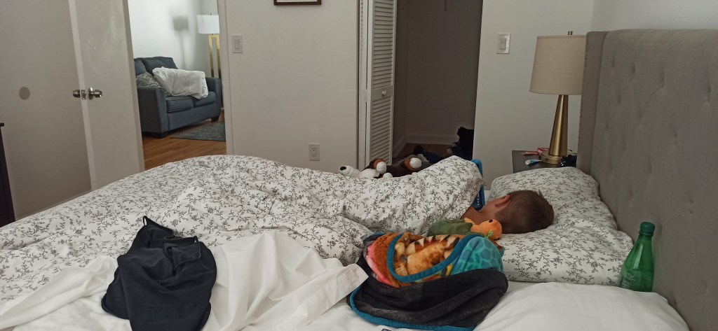 Mitten in der Nacht wacht Ben auf und klagt über Schmerzen und, dass ihm so kalt sei. 38 Grad. Geht noch. Doch am Morgen holten wir uns aus der Apotheke ein paar Meds, wer weiß wie sich das entwickelt. Es dauerte auch nur 3 Stunden und er glühte. Den Saft fand er furchtbar, würgte ihn jedoch herunter. Dieser Tag würde wie folgt aussehen: im Bett abhängen (gut, dass es gefühlt 3m breit war), Film schauen, Schlafen, Essen, Schlafen. Wir ziehen das gnadenlos bis 19 Uhr durch. Dann kamen Bubba und Deanna an. Ben hielt sich wacker, doch die 39° Marke behielten wir bei. Diese Nacht schlief er dann gute 12 Stunden.